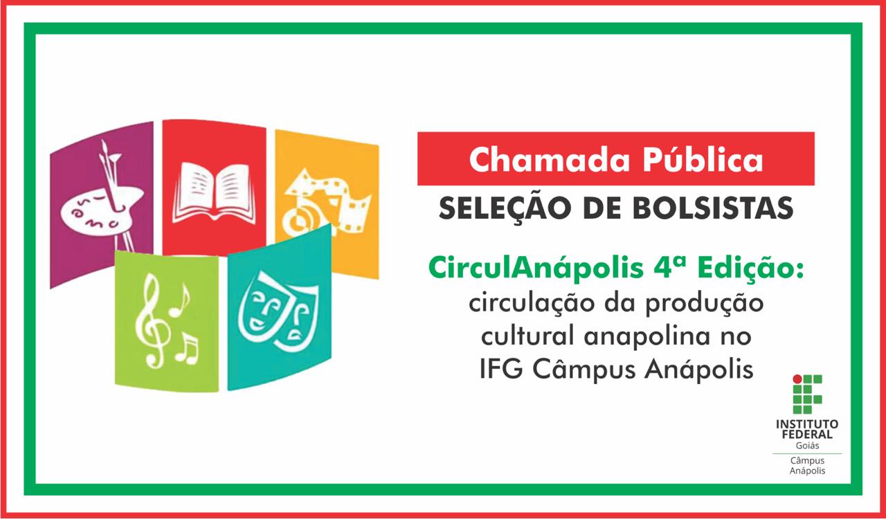 O Câmpus Anápolis do IFG, por intermédio da Gerência de Pesquisa, Pós-Graduação e Extensão, publicou mais um edita de chamada pública. Desta vez é o Projeto de Extensão CirculAnápolis – 4ª Edição: circulação da produção cultural anapolina no IFG Câmpus Anápolis. São disponibilizadas duas vagas para estudantes dos cursos técnicos integrados, que receberão bolsas no valor de R$200, e duas vagas para estudantes do ensino superior, curso de licenciatura em Ciências Sociais, que receberão bolsas no valor de R$400, com recursos oriundos da Pró-Reitoria de Extensão do IFG. Para se inscrever, o candidato deve preencher o formulário de inscrição disponível aqui. As inscrições vão até 3 de novembro. Veja o Edital.