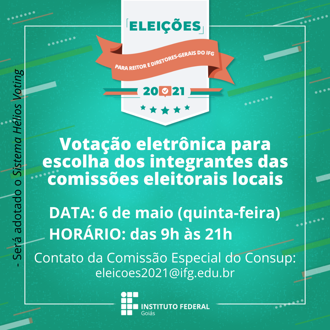 Servidores e estudantes do Instituto Federal de Goiás (IFG) poderão escolher os membros das Comissões Eleitorais locais que vão conduzir as eleições para reitor e diretores-gerais. A votação ocorrerá nesta quinta-feira, 6, eletronicamente, das 9 às 21 horas, por meio do Sistema Helios Voting.
