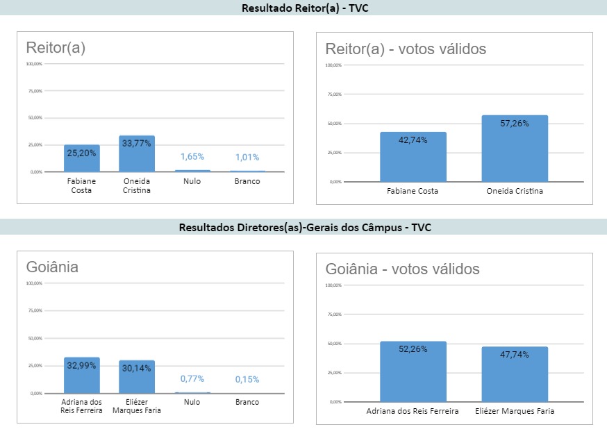 resultado preliminar do segundo turno das eleições aos cargos de reitor e de diretor-geral do Câmpus Goiânia do Instituto Federal de Goiás (IFG) foi publicado nesta manhã, 25, pela Comissão Eleitoral Central, no site das eleições 2021 (acesse). A apuração dos votos foi realizada ontem e transmitida ao vivo (acesse a transmissão) pelo YouTube, no canal IFG oficial. De acordo com o resultado, foi eleita para o cargo de reitora a professora Oneida Barcelos Irigon, com 57,6% de votos válidos. No Câmpus Goiânia, foi eleita para direção geral a professora Adriana dos Reis, com 52,26% dos votos válidos.