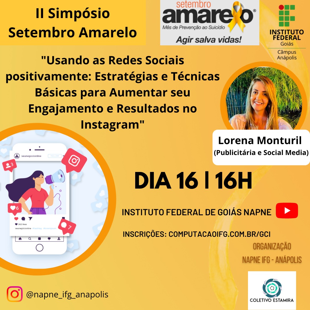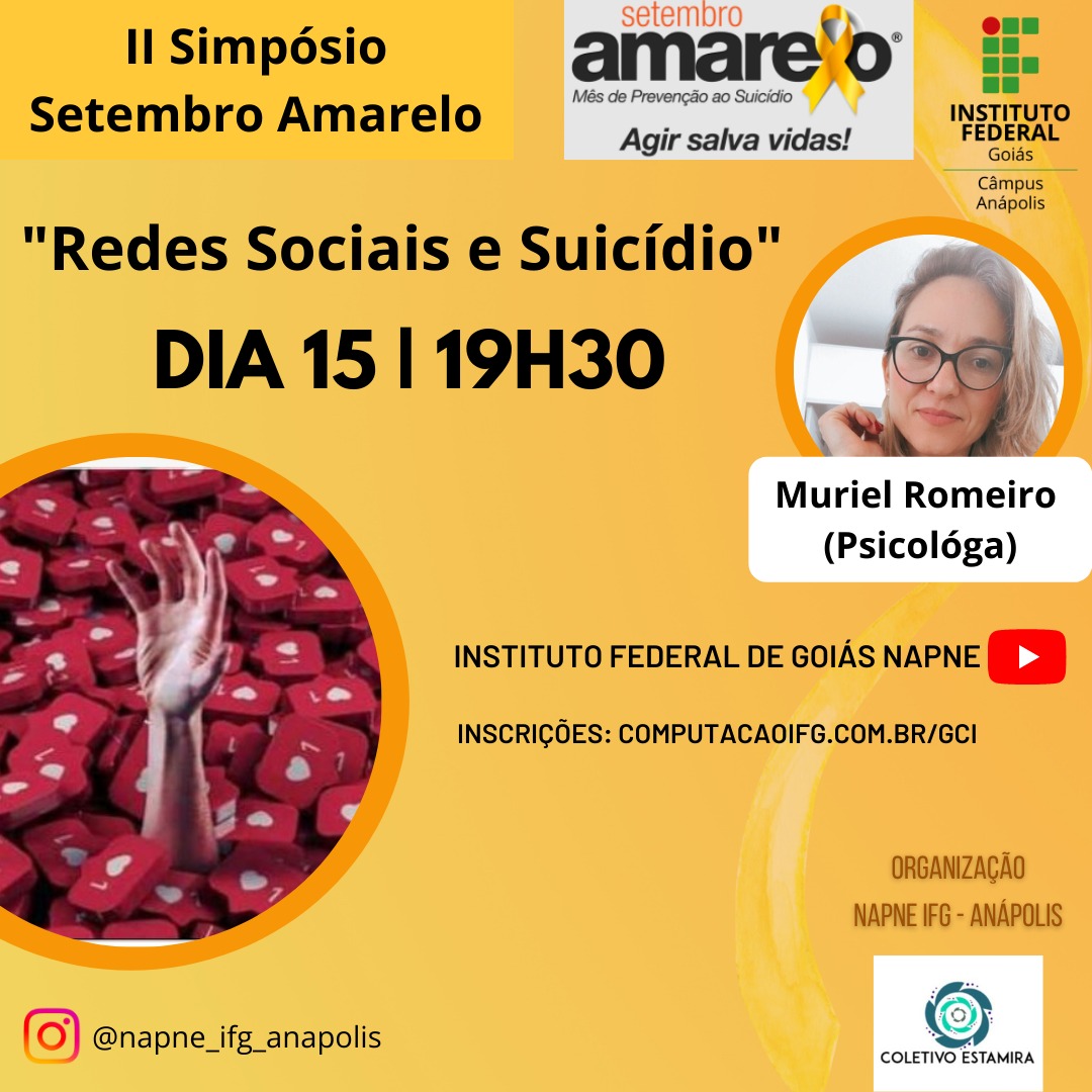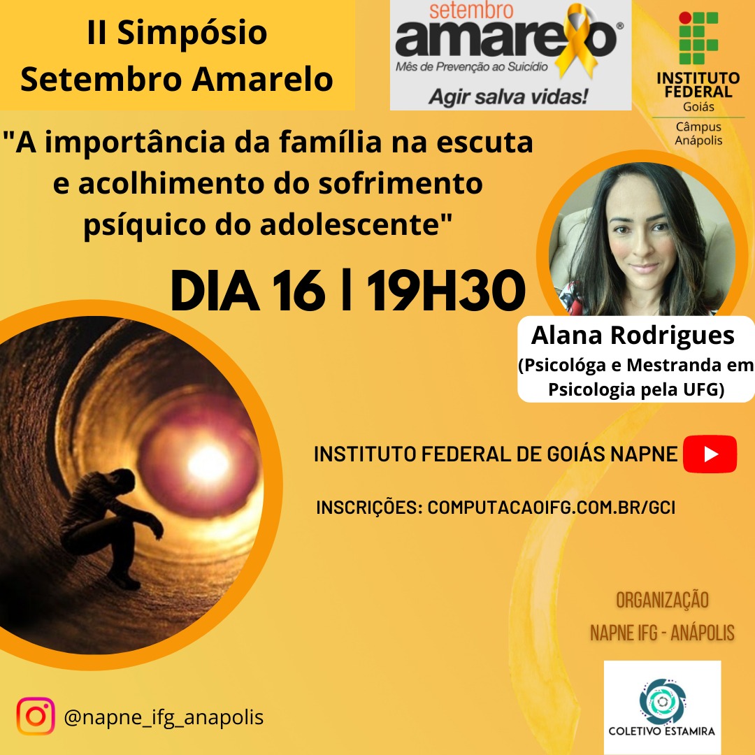 O Instituto Federal de Goiás (IFG) – Câmpus Anápolis promoverá, nos próximos dias 15 e 16 de setembro, o II Simpósio Setembro Amarelo. Organizado pelo Núcleo de Atendimento às Pessoas com Necessidades Específicas (NAPNE) da unidade de ensino com apoio do Coletivo Estamira, o evento é aberto à comunidade em geral. Todas as atividades serão realizadas no canal do NAPNE do IFG Anápolis no YouTube (acesse o canal, clicando aqui). Para receber a certificação pela participação nas atividades, é preciso se inscrever previamente no seguinte site: www.computacaoifg.com.br/gci. O Setembro Amarelo é uma referência à campanha mundial de mesmo nome cujo objetivo principal é abordar estratégias de conscientização sobre a prevenção do suicídio.
