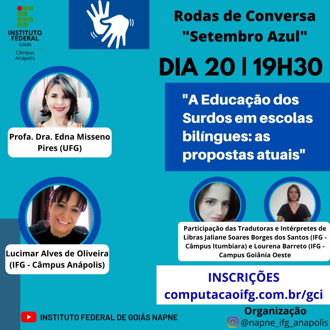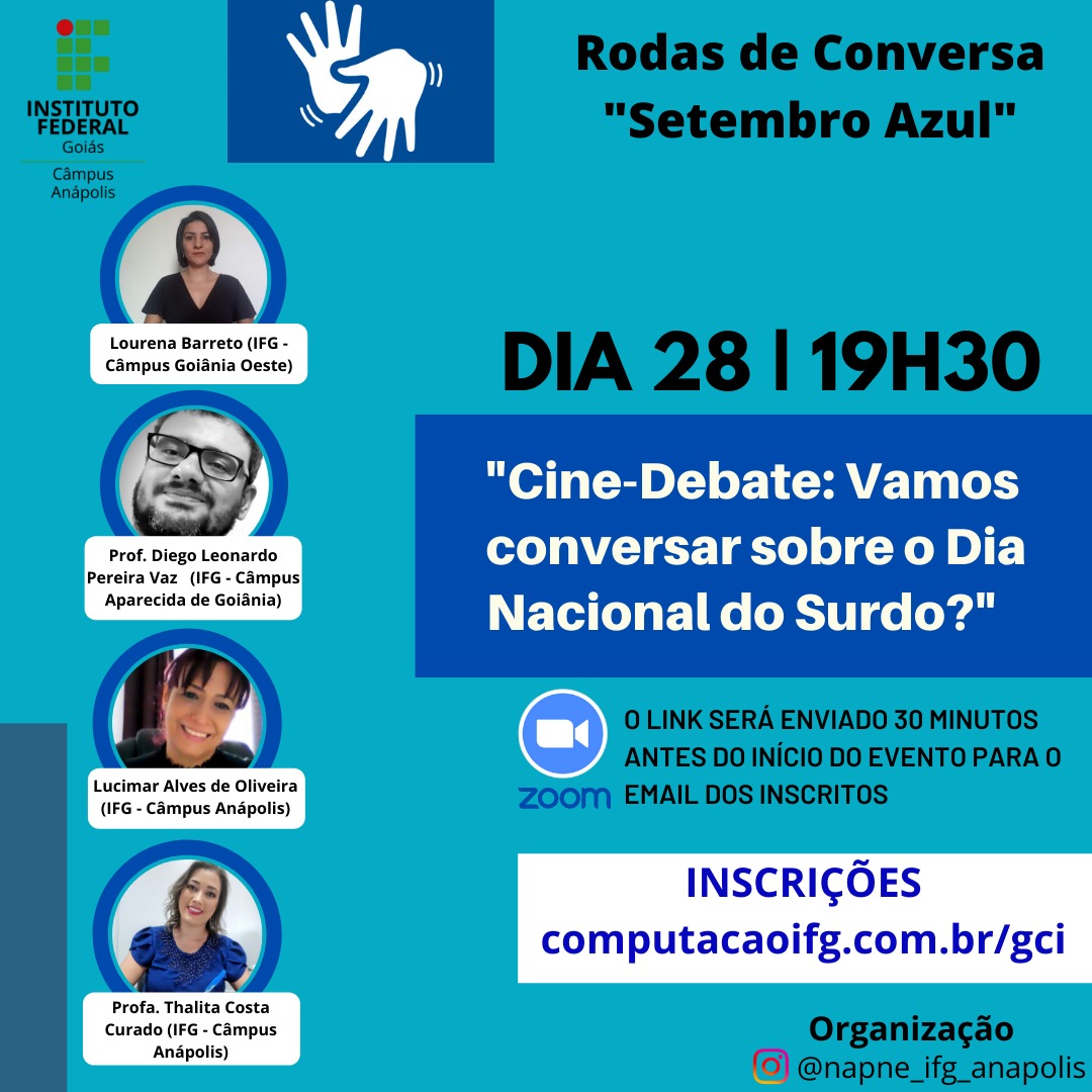 O Instituto Federal de Goiás (IFG) – Câmpus Anápolis está com inscrições abertas para as Rodas de Conversa “Setembro Azul”, que serão realizadas pelo Núcleo de Atendimento às Pessoas com Necessidades Específicas (NAPNE) do câmpus nos próximos dias 20 e 28 de setembro. As inscrições estão abertas para participação do público em geral e podem ser efetivadas no seguinte site: www.computacaoifg.com.br/gci