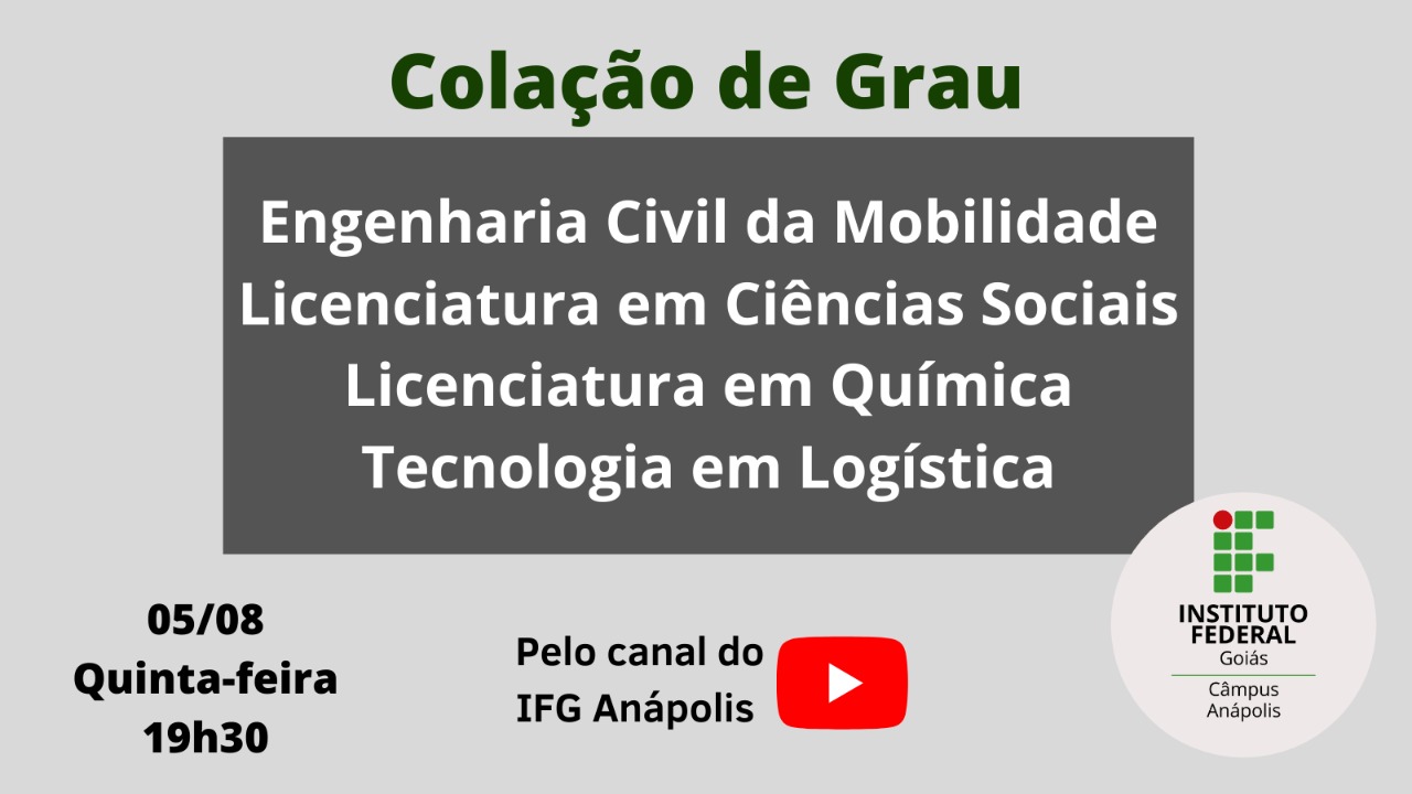 O Instituto Federal de Goiás (IFG) - Câmpus Anápolis promoverá na noite da próxima quinta-feira, 5 de agosto, a cerimônia de colação de grau dos formandos dos cursos de bacharelado...