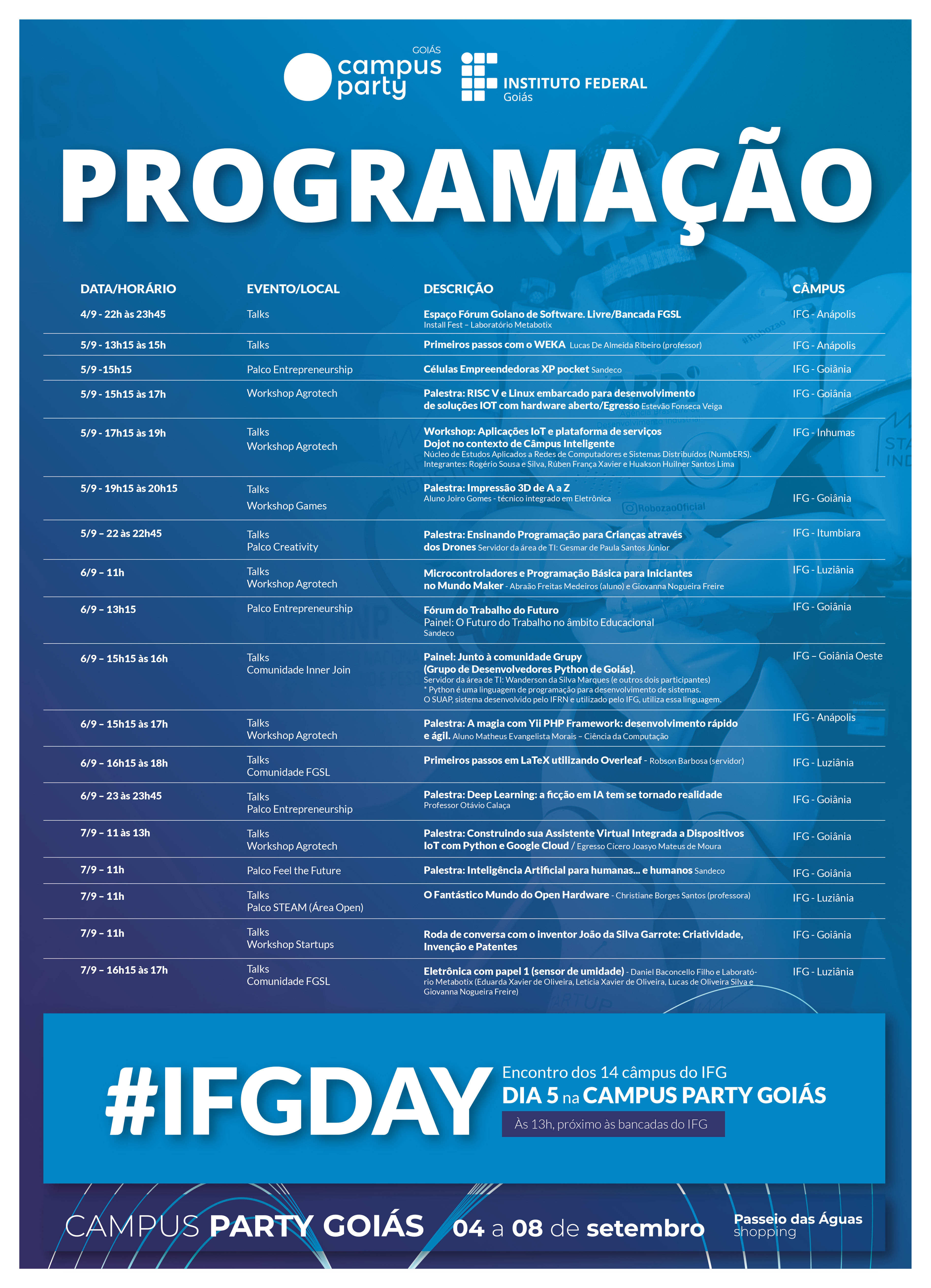 A programação do evento começa diariamente, normalmente às 11 horas. Há espaços gratuitos, na chamada Campus Future, com exposição do IFG nos dias 7 e 8, das 11 às 21 horas. Aqui os participantes dos câmpus Inhumas, Goiânia, Senador Canedo e Aparecida vão mostrar os projetos: desenvolvimento e aplicação IoT (internet das coisas) controladas por comando de voz, com o Google Assistant, SmartCap e Smartshoes: provendo acessibilidade a deficientes visuais por meio da Internet das CoisasSmart Lab: gerenciamento de consumo energético por meio de aplicações IoTTalkingPepper: uma pimenteira conectada à Internet , Smart e-health: telemedicina e monitoramento remoto da saúde de pacientesMonitoramento de Poluição Atmosférica em Goiânia utilizando Nariz EletrônicoSky Rocket Team, Monitoramento de Poluição Atmosférica em Goiânia utilizando Nariz Eletrônico, Sky Rocket Team, Desenvolvimento e construção de um carro modelo fórmula para competição Fórmula SAE, Automatização de Sistema de Abastecimento de Reservatórios de Água Compartilhado, Luvas Transceptoras e Hardware para medir o tempo de reação.