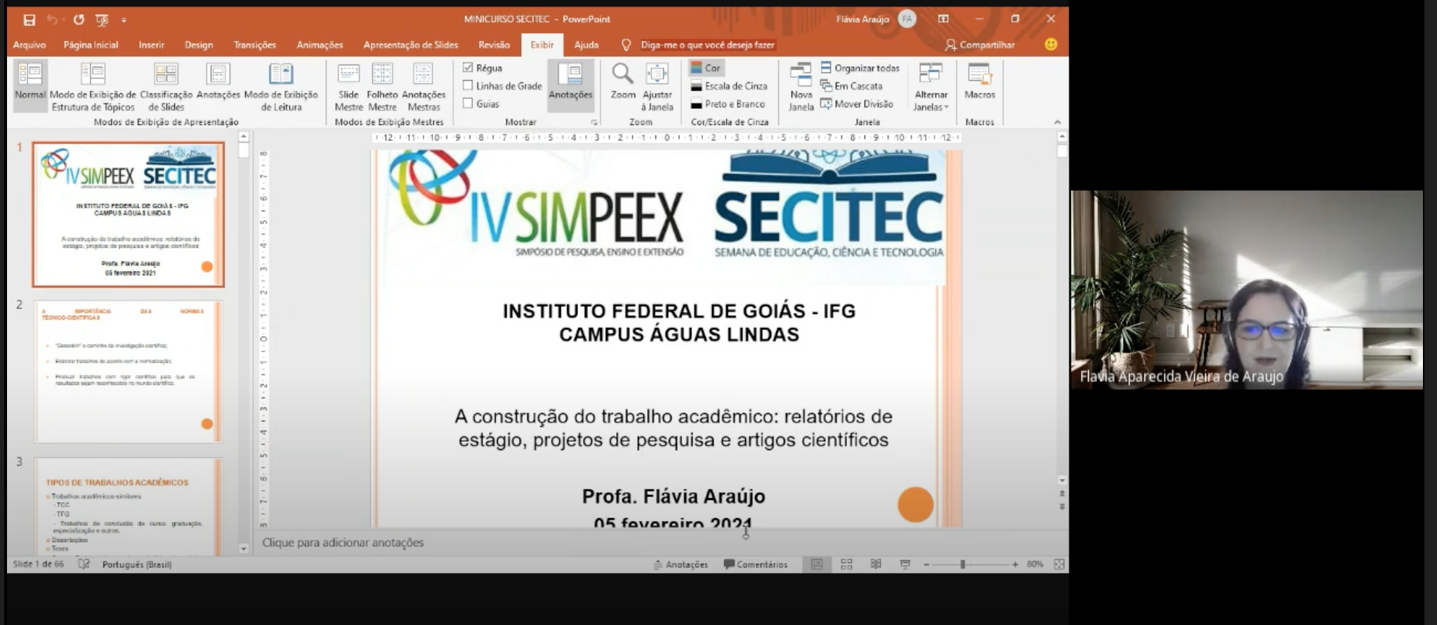 No IFG Águas Lindas, a VI Secitec finalizou na sexta-feira (05/02) com o minicurso da professora Flávia Araújo “A construção do trabalho acadêmico: relatórios de estágio, projetos de pesquisa e artigos científicos”, voltado para os estudantes da Educação de Jovens e Adultos (EJA) do câmpus. O minicurso foi mediado pela professora Thalita Soares e ocorreu via Google Meet. As palestras que ocorreram na VI Secitec nos dias 1 e 2 de fevereiro estão disponíveis em nosso canal no YouTube.