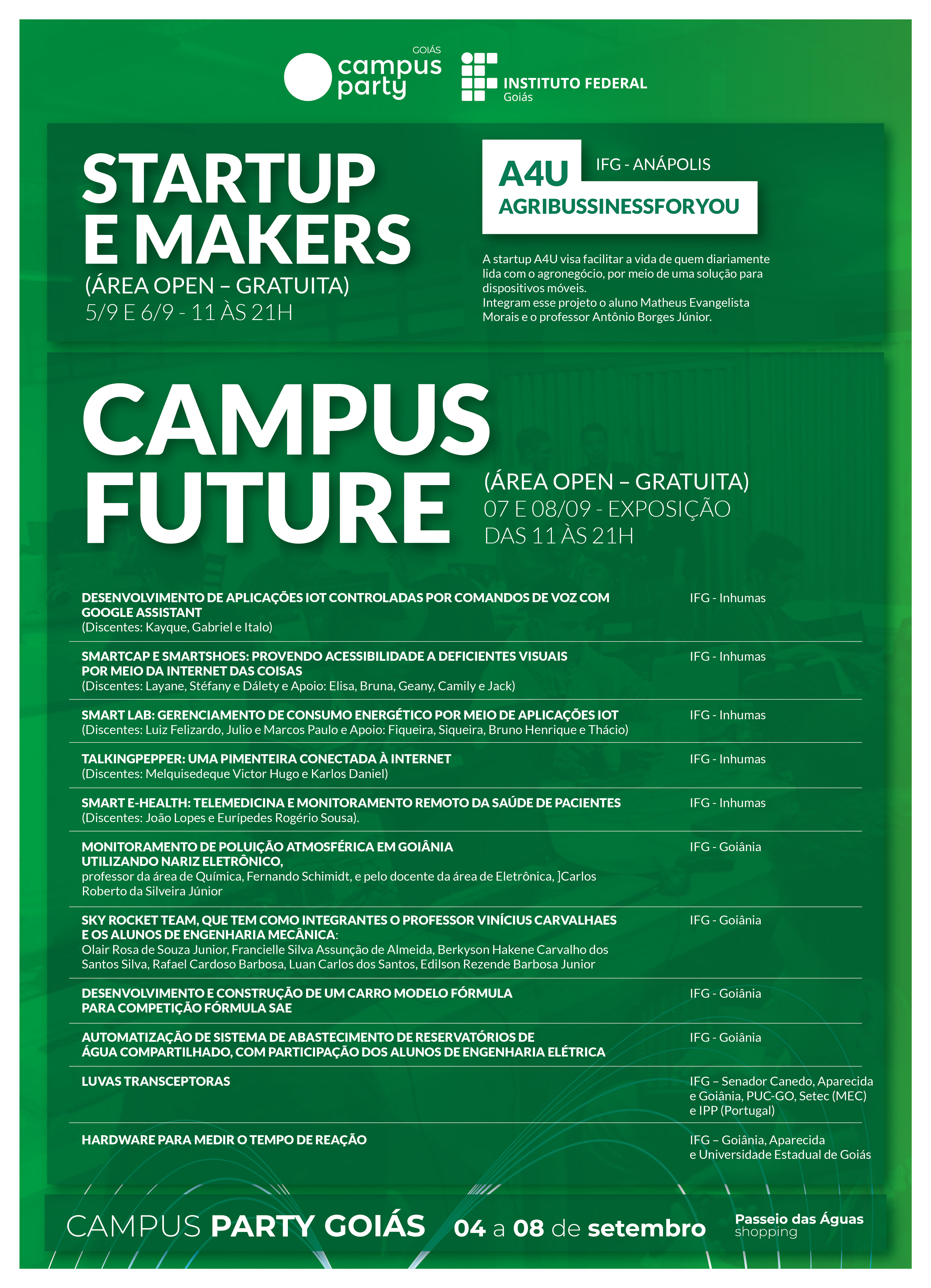 A programação do evento começa diariamente, normalmente às 11 horas. Há espaços gratuitos, na chamada Campus Future, com exposição do IFG nos dias 7 e 8, das 11 às 21 horas. Aqui os participantes dos câmpus Inhumas, Goiânia, Senador Canedo e Aparecida vão mostrar os projetos: desenvolvimento e aplicação IoT (internet das coisas) controladas por comando de voz, com o Google Assistant, SmartCap e Smartshoes: provendo acessibilidade a deficientes visuais por meio da Internet das Coisas, Smart Lab: gerenciamento de consumo energético por meio de aplicações IoT, TalkingPepper: uma pimenteira conectada à Internet , Smart e-health: telemedicina e monitoramento remoto da saúde de pacientes, Monitoramento de Poluição Atmosférica em Goiânia utilizando Nariz Eletrônico, Sky Rocket Team, Monitoramento de Poluição Atmosférica em Goiânia utilizando Nariz Eletrônico, Sky Rocket Team, Desenvolvimento e construção de um carro modelo fórmula para competição Fórmula SAE, Automatização de Sistema de Abastecimento de Reservatórios de Água Compartilhado, Luvas Transceptoras e Hardware para medir o tempo de reação.