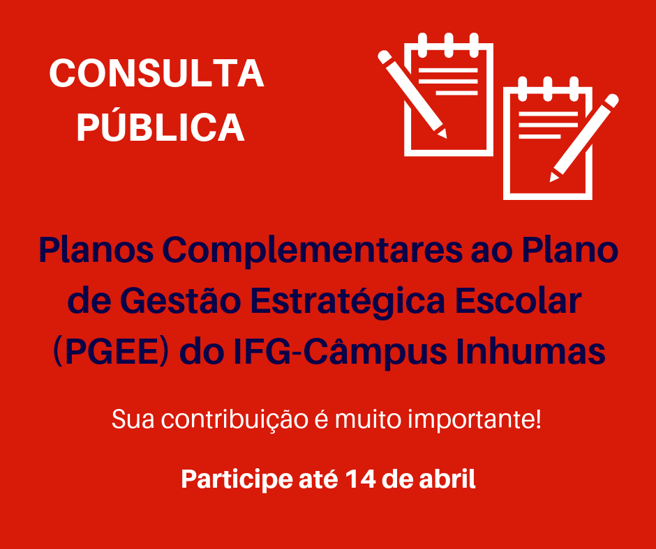 O Plano de Gestão Estratégica Escolar (PGEE) do IFG-Câmpus Inhumas, que vem sendo discutido com a comunidade nos últimos meses, começa agora uma nova fase: o período em que os planos complementares estarão disponíveis para consulta pública. Até 14 de abril, servidores e alunos poderão analisar as propostas dos sete planos complementares elaborados pelos grupos de trabalho (GTs) e sugerir inclusões, alterações e/ou supressões.