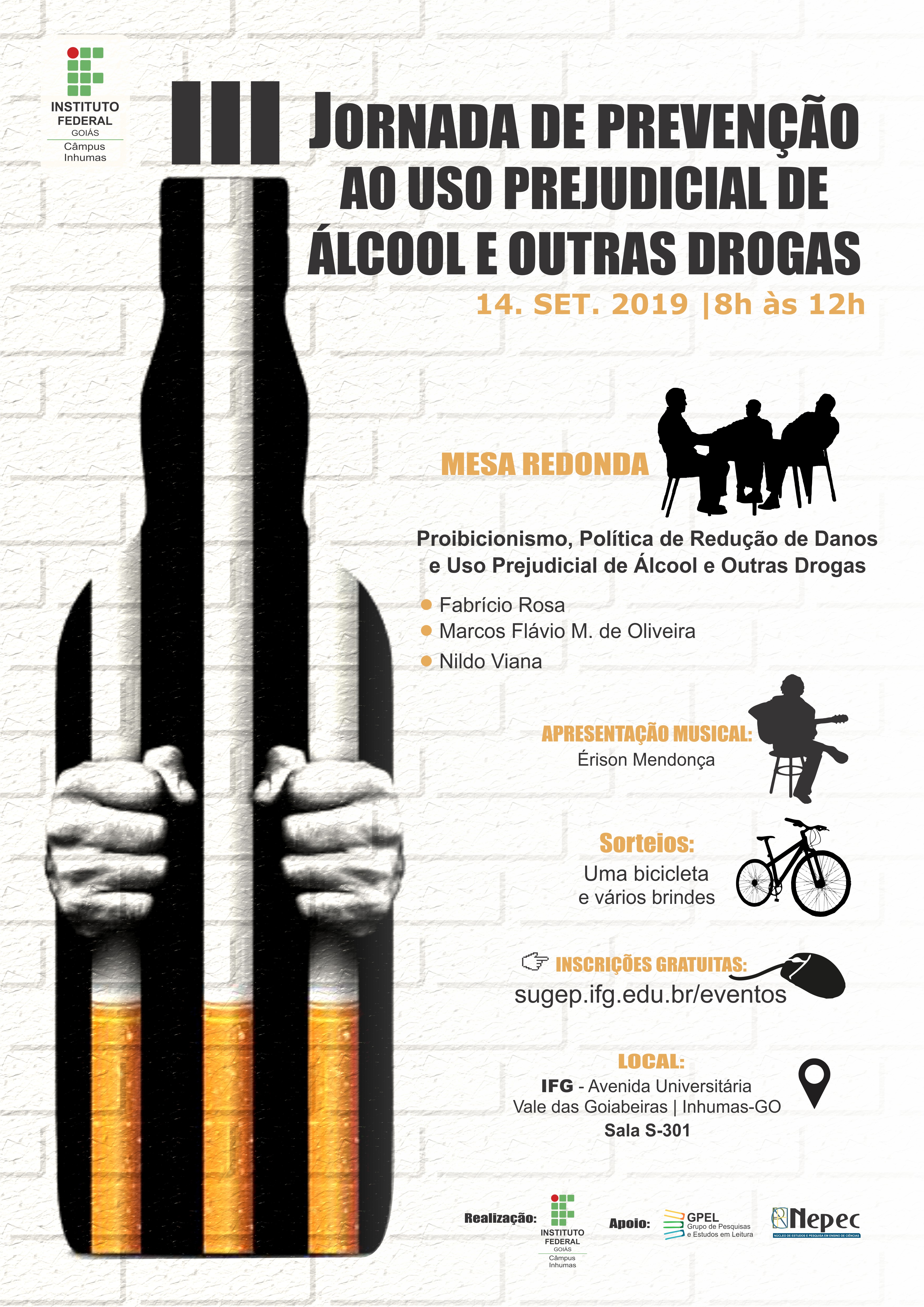 Você está aqui: Página inicial > Editais > Pesquisa e Inovação - Em andamento > IFG > Câmpus > Inhumas > Notícias do Câmpus Inhumas > Inscrições abertas para a III Jornada de Prevenção ao Uso Prejudicial de Álcool e outras Drogas