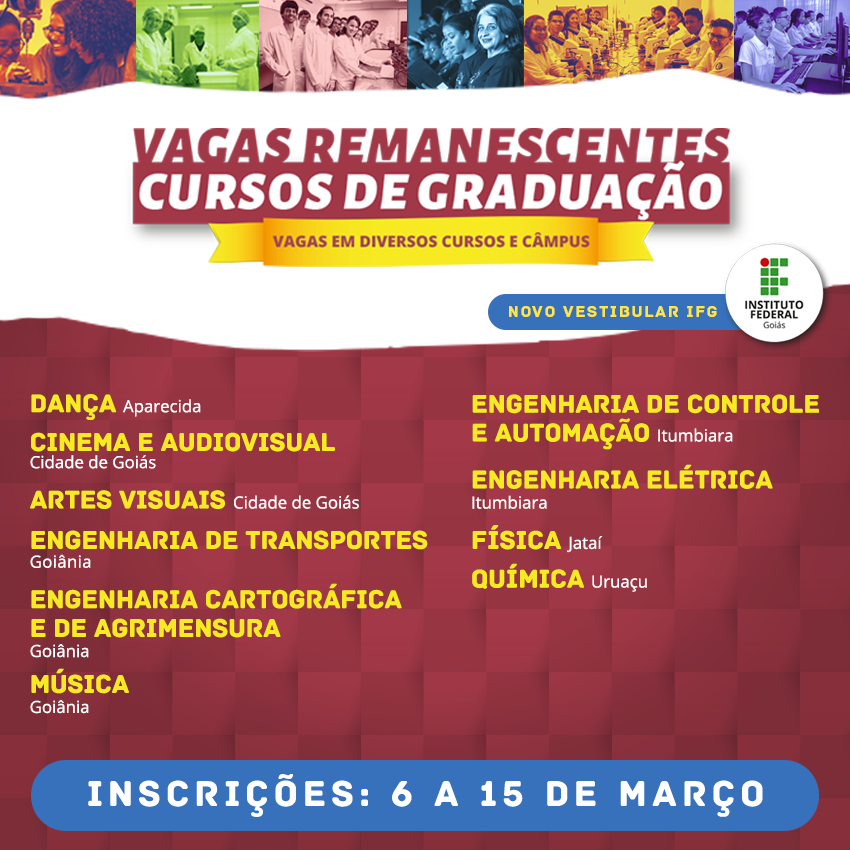 O Centro de Seleção do Instituto Federal de Goiás (IFG) publicou nesta sexta-feira, 6 de março, o edital do novo vestibular de vagas remanescentes. A seleção apresenta 180 vagas remanescentes, divididas em 10 cursos em seis câmpus do IFG. Há vagas para os câmpus: Aparecida de Goiânia, Cidade de Goiás, Goiânia, Itumbiara, Jataí e Uruaçu. As inscrições são gratuitas, pela internet, e devem ser realizadas até o dia 15 de março e a seleção consistirá em prova de redação, a ser aplicada no dia 22 de março.
