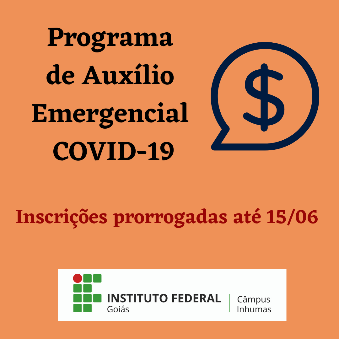 A Gerência de Pesquisa, Pós-Graduação e Extensão do IFG-Câmpus Inhumas informa que o prazo de inscrições para o edital do Programa de Auxílio Financeiro de Assistência Estudantil na modalidade Emergencial Covid-19 foi prorrogado até o dia 15 de junho, próxima segunda-feira. Para realizar a inscrição, o aluno deve preencher ou atualizar o questionário de caracterização socioeconômica disponível no Sistema Unificado de Administração Pública (SUAP), no endereço eletrônico https://suap.ifg.edu.br/, e enviar o formulário de inscrição e caracterização socioeconômica (Anexo 1 do Edital 07/2020) para o e-mail cae.inhumas@ifg.edu.br.