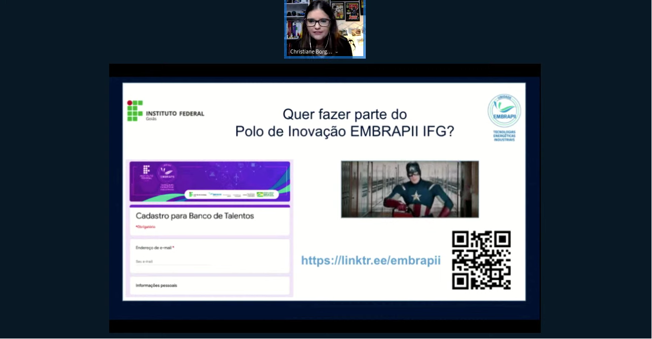 Estudantes e servidores da Instituição podem se credenciar no Polo EMBRAPII para participar dos projetos a serem desenvolvidos, principalmente na área de Tecnologias Energéticas Industriais, área de competência da unidade, como contou a professora Christiane Borges, coordenadora de Recursos Humanos do Polo. Ela mostrou o formulário de credenciamento a ser preenchido para compor o banco de talentos de pesquisadores credenciados- https://linktr.ee/embrapii.