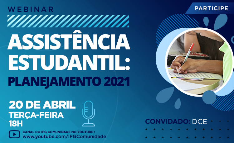 A Pró-Reitoria de Extensão (Proex) do Instituto Federal de Goiás (IFG) promoverá no dia 20 de abril, terça-feira, às 18h, um webinar com o tema “Assistência Estudantil: Planejamento”. O webinar será transmitido no Canal IFG Comunidade