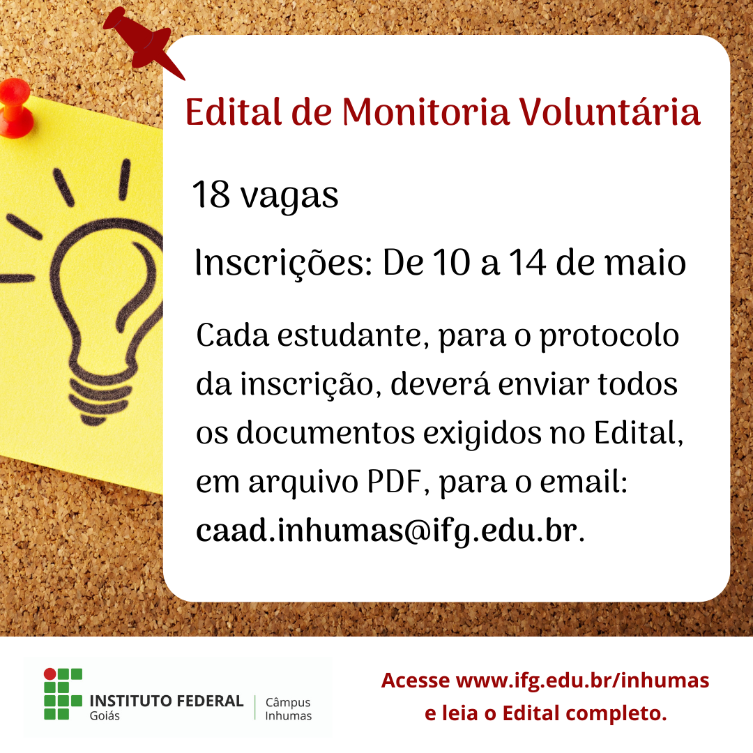 Você está aqui: Página inicial > Editais > Pesquisa e Inovação - Em andamento > IFG > Câmpus > Inhumas > Notícias do Câmpus Inhumas > Inscrições abertas para Edital de Monitoria Voluntária