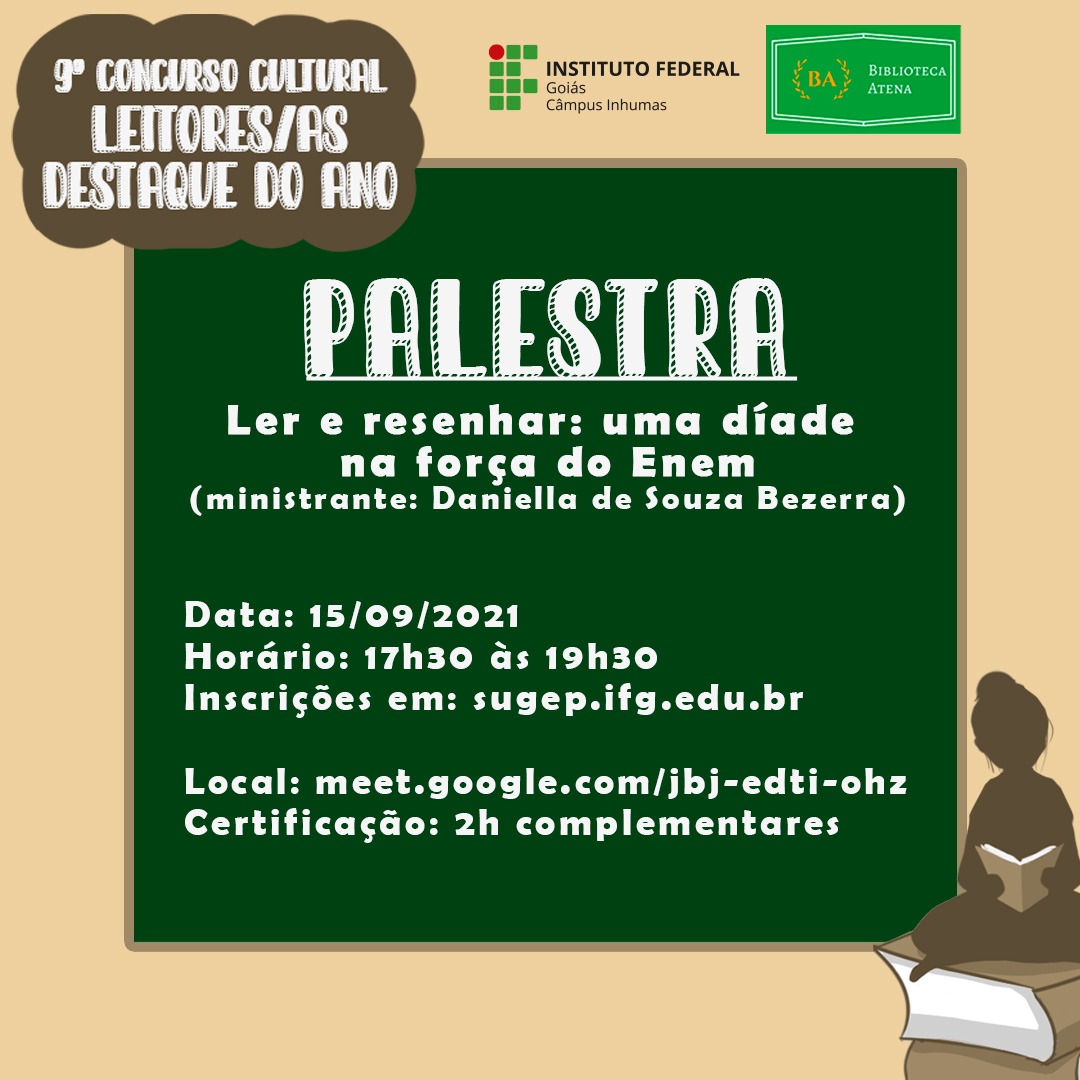 Você está aqui: Página inicial > Editais > Pesquisa e Inovação - Em andamento > IFG > Câmpus > Inhumas > Notícias do Câmpus Inhumas > Palestra "Ler e Resenhar: uma díade na força do Enem" será realizada dia 15 de setembro