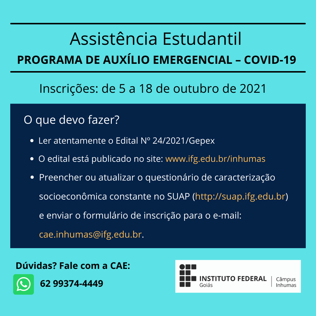 Em caso de dúvidas, o interessado deve entrar em contato com a Coordenação de Assistência Estudantil (CAE) do IFG-Câmpus Inhumas, pelo WhatsApp 62 99374-4449.