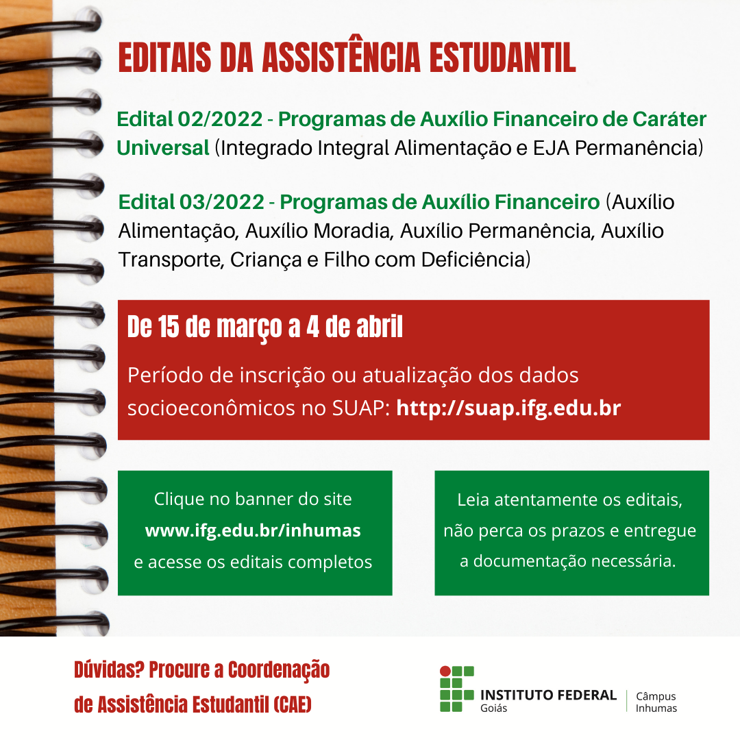 Edital 03/2022 diz respeito aos Programas de Auxílio Financeiro: Alimentação, Moradia Estudantil, Permanência, Transporte, Criança e Filho com Deficiência. Podem se inscrever nesses programas de auxílio financeiro todos os estudantes ingressantes e veteranos matriculados nos cursos: Técnico Integrado ao Ensino Médio; Técnico Integrado na Modalidade Educação de Jovens e Adultos (EJA) e de graduação.