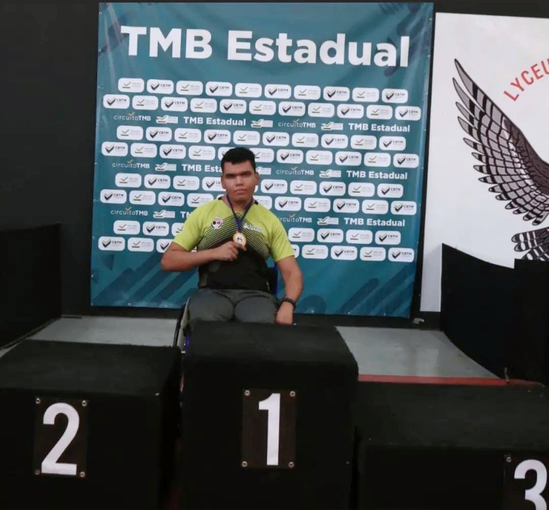 Estudante Oscar Júnior no pódio com a medalha de ouro