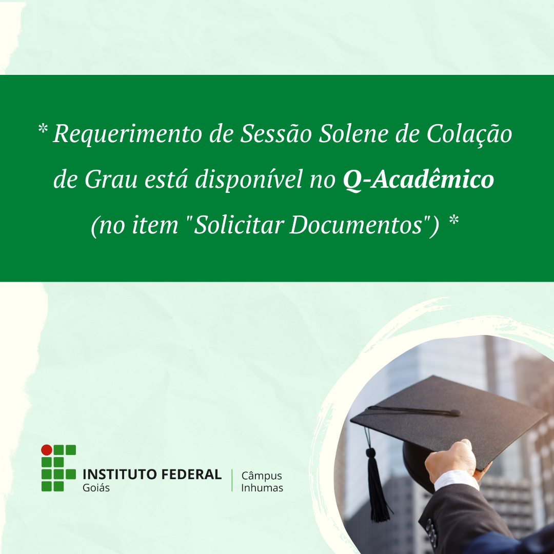 A Coordenação de Registros Acadêmicos e Escolares (Corae) do IFG-Câmpus Inhumas divulgou novas orientações para que o discente solicite a participação na Solenidade de Colação de Grau. Para o evento deste semestre, os estudantes que já cumpriram todos os componentes curriculares — disciplinas, estágio, Trabalho de Conclusão de Curso (TCC) e atividades complementares — devem baixar o Requerimento de Sessão Solene de Colação de Grau, que está disponível no Q-Acadêmico, e entregar na Corae, presencialmente ou por e-mail (corae.inhumas@ifg.edu.br), até o dia 26 de fevereiro.