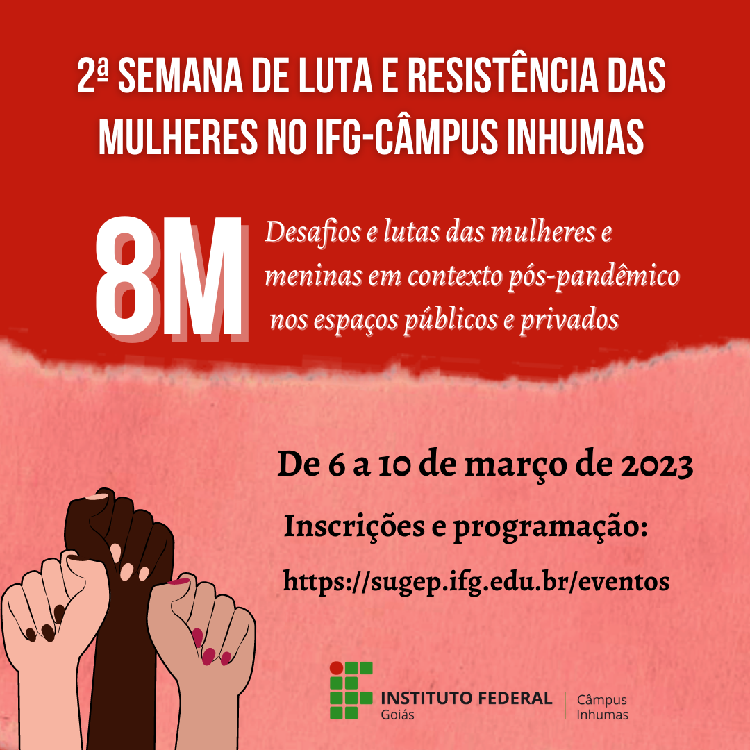 De 6 a 10 de março, será realizada a 2ª Semana de Luta e Resistência das Mulheres no IFG-Câmpus Inhumas - 8M: Desafios e Lutas das Mulheres e Meninas em Contexto Pós-Pandêmico nos Espaços Públicos e Privados. As inscrições devem ser feitas pelo site do Sugep: https://sugep.ifg.edu.br/eventos/#/. Haverá certificação para os participantes inscritos e as atividades serão realizadas majoritariamente de forma presencial nos espaços do Câmpus Inhumas.