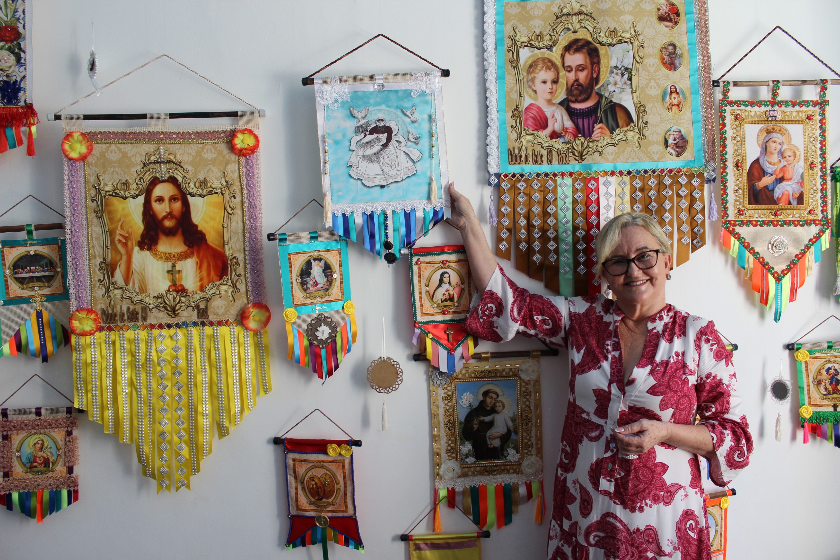 Uma das exposições foi realizada no Centro de Memória e Cultura do Poder Judiciário do Estado. Nela, Maria da Cruz Cardoso apresentou uma mostra de seu trabalho que traz em estandartes artesanais um pouco do sincretismo religioso brasileiro. Segundo Maria da Cruz, a criação dos estandartes surgiu como uma atividade depois que ela, professora da educação infantil, se aposentou: “começou com um trabalho que fiz para minha família e de repente foi crescendo e hoje recebo encomendas do Brasil inteiro”. Participando pela primeira vez do Festival de Artes, Maria falou da importância de poder expor o seu trabalho em um evento como o do IFG: “essa oportunidade é muito importante para que as pessoas possam conhecer aquilo que fazemos. Essa divulgação é essencial”.