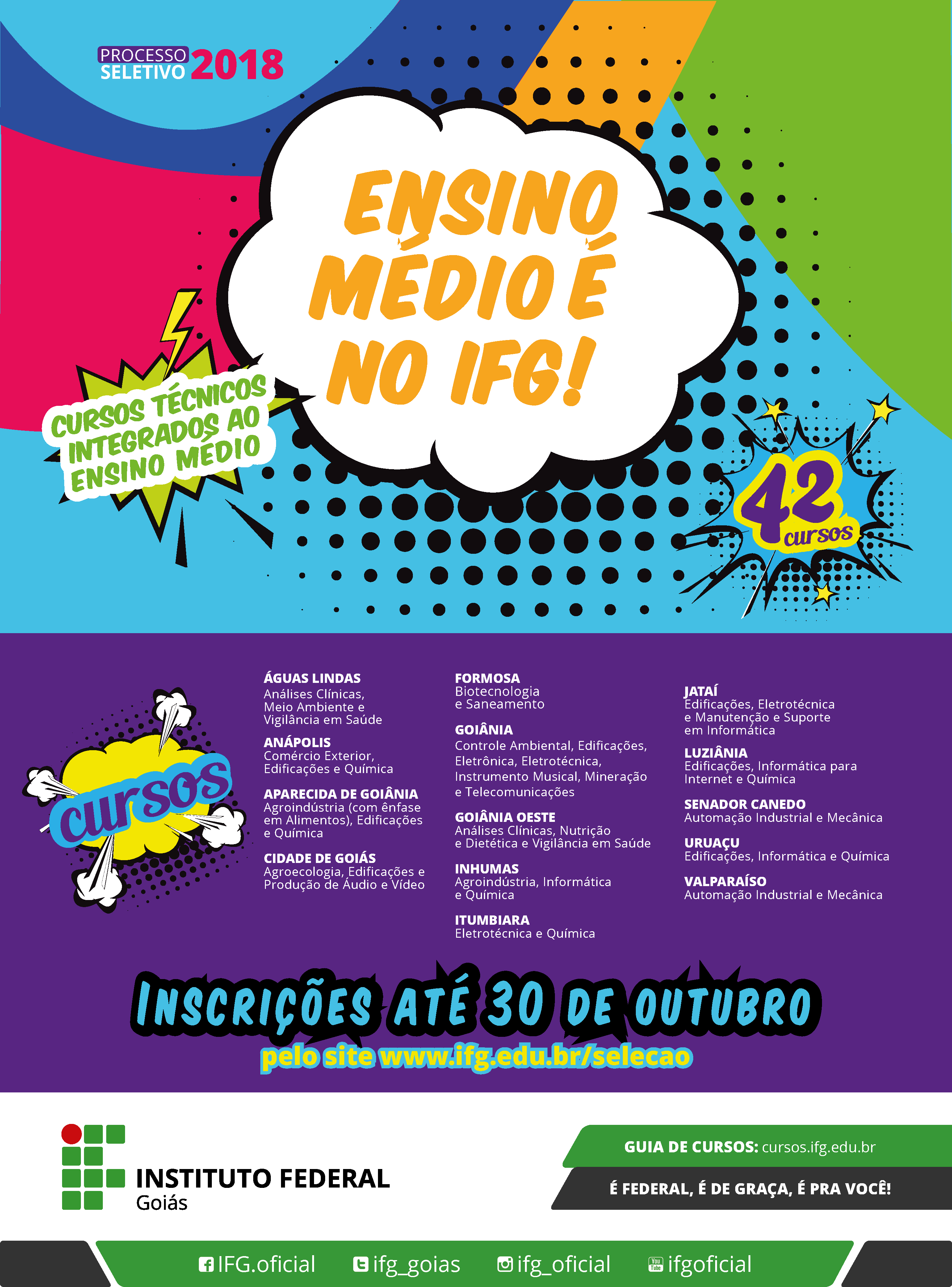 Você está aqui: Página inicial > Editais > Pesquisa e Inovação - Em andamento > IFG > Câmpus > Inhumas > Notícias do Câmpus Inhumas > IFG abre inscrições para 1260 vagas em cursos técnicos integrados ao Ensino Médio no dia 4 de outubro