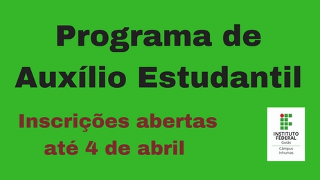 Você está aqui: Página inicial > Editais > Pesquisa e Inovação - Em andamento > IFG > Câmpus > Inhumas > Notícias do Câmpus Inhumas > Inscrições abertas para o processo seletivo do Programa de Auxílio Financeiro Estudantil