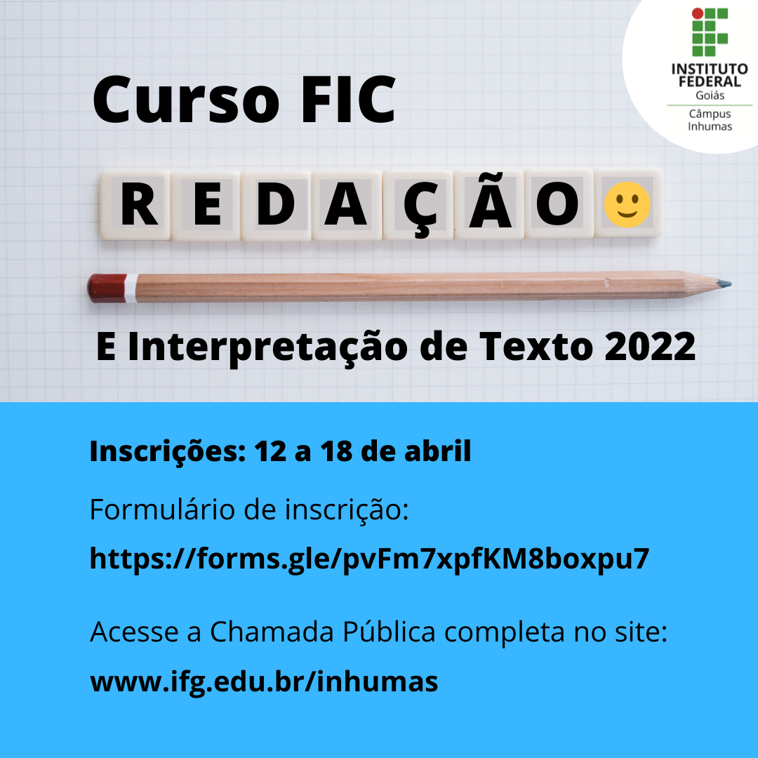Estão abertas, até o dia 18 de abril, as inscrições para o curso FIC Redação e Interpretação de Texto 2022 do IFG-Câmpus Inhumas. Para participar, o interessado deve preencher o formulário no seguinte link: https://forms.gle/pvFm7xpfKM8boxpu7. A ação de extensão oferta no total 50 vagas, sendo 40 para a comunidade externa e 10 para a comunidade interna. A seleção dos candidatos...