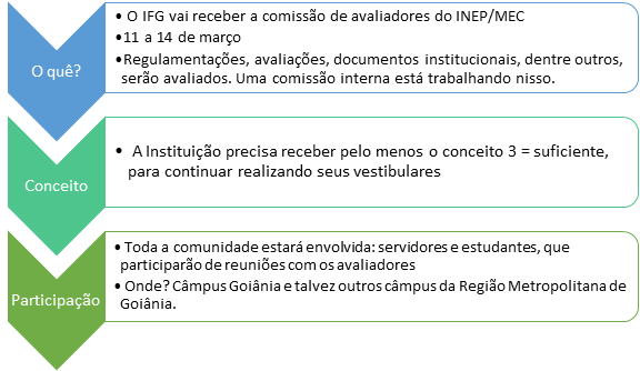 Nos próximos dias 11 a 14 de março, o Instituto Federal de Goiás passará por um momento de grande importância institucional, o Recredenciamento para continuação da oferta de seus cursos superiores. Uma equipe de avaliadores externos do Instituto Nacional de Estudos e Pesquisas Educacionais Anísio Teixeira (Inep) fará visitas inicialmente no Câmpus Goiânia, mas há possibilidade de o grupo percorrer outros câmpus da Região Metropolitana de Goiânia.