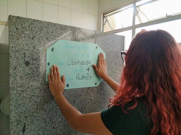 Com isso em mente, e inspiradas por exemplos da internet, elas resolveram escrever diversos cartazes com frases sobre empoderamento, elevação da autoestima, quebra de padrões estéticos, crença em si próprio e respeito pelos demais e espalhar pelos banheiros onde mais circulam as estudantes do nível médio.