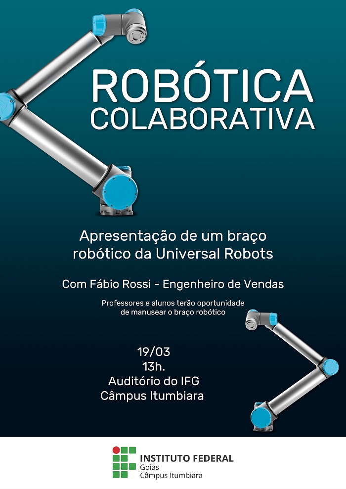 Está agendada para amanhã, dia 19 de março, a demonstração das funcionalidades de um braço robótico da marca Universal Robots. O convite para apresentação na Instituição partiu da própria empresa, e a demonstração será feita pelo engenheiro de vendas, Fábio Rossi, a partir das 13h, no auditório do IFG Câmpus Itumbiara.