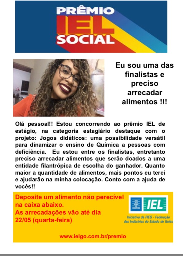 A jovem estudante também está participando do concurso Prêmio IEL Social de Estágio, que tem por objetivo arrecadar doações para entidades filantrópicas. Quem quiser colaborar com a arrecadação de doações para o IEL Social e colaborar com a participação da Alessandra no concurso poderá fazer sua contribuição até o dia 22 de maio.