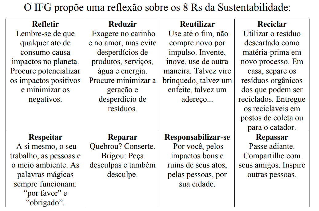 A Semana do Meio Ambiente do Câmpus Itumbiara foi baseada no conceito dos 8Rs da Sustentabilidade que são: