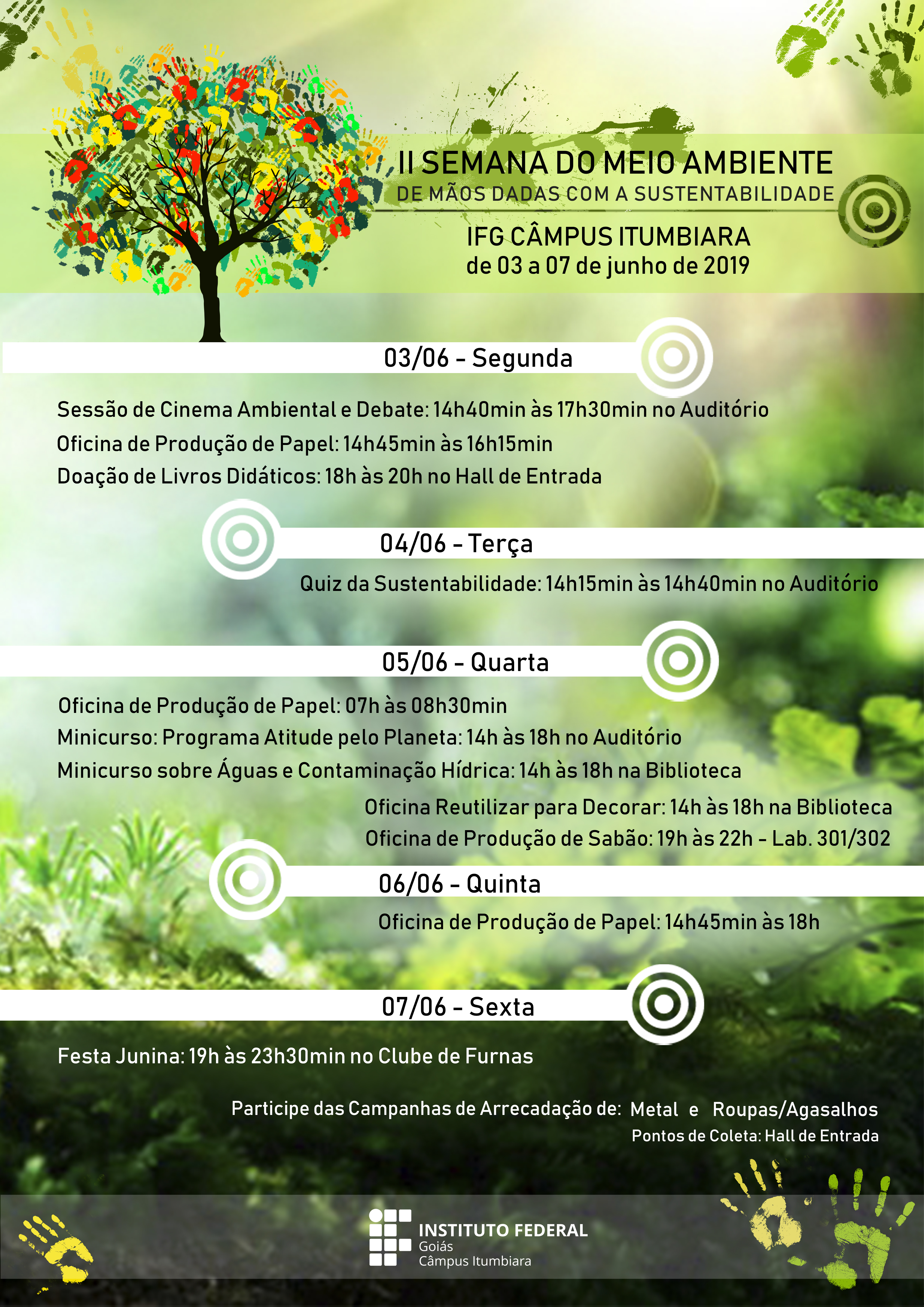 O IFG Câmpus Itumbiara está preparando diversas atividades em comemoração à Semana Mundial do Meio Ambiente (celebrada de 1º a 5 de junho). Por conta disso, oficinas, minicursos e sessão de cinema estão programadas para ocorrer entre a segunda e sexta-feira da próxima semana.