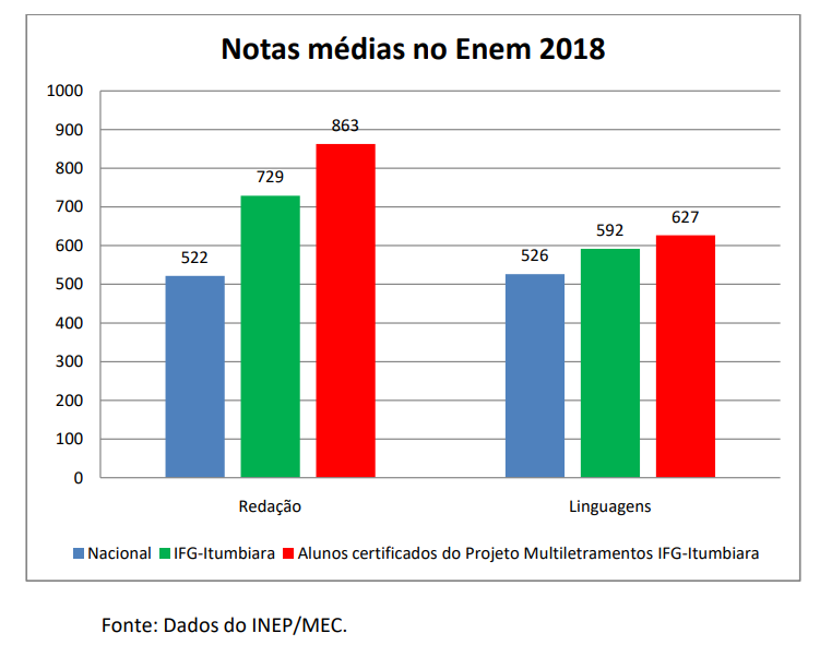 As idealizadoras do Projeto de Ensino Multiletramentos divulgaram um gráfico comparativo das notas de redação e linguagem do Exame Nacional do Ensino Médio (Enem). E, de acordo com os resultados, elas têm muito a comemorar, uma vez que os participantes do Projeto em 2018 superaram a média geral nacional e também a média de outros estudantes do IFG Câmpus Itumbiara.