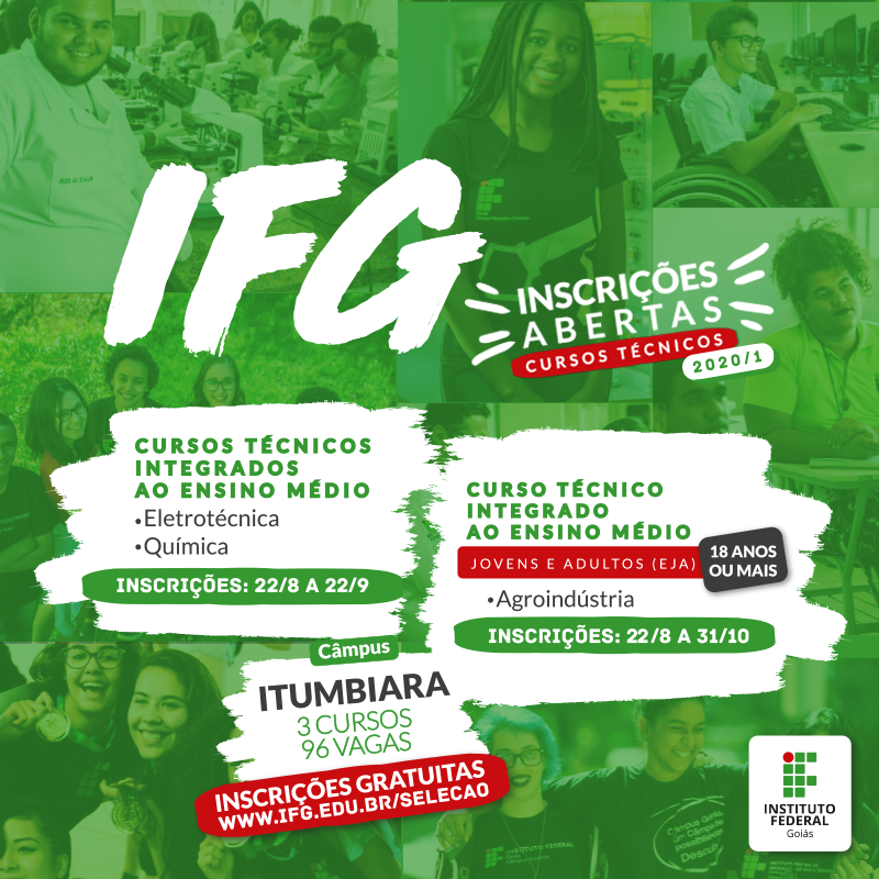 Estão abertas as inscrições para preenchimento de vagas em cursos técnicos do Instituto Federal de Goiás (IFG), para ingresso no primeiro semestre de 2020. No IFG Câmpus Itumbiara há vagas para cursos técnicos integrados ao ensino médio, e para cursos técnicos integrados ao ensino médio, destinados a jovens e adultos (EJA).