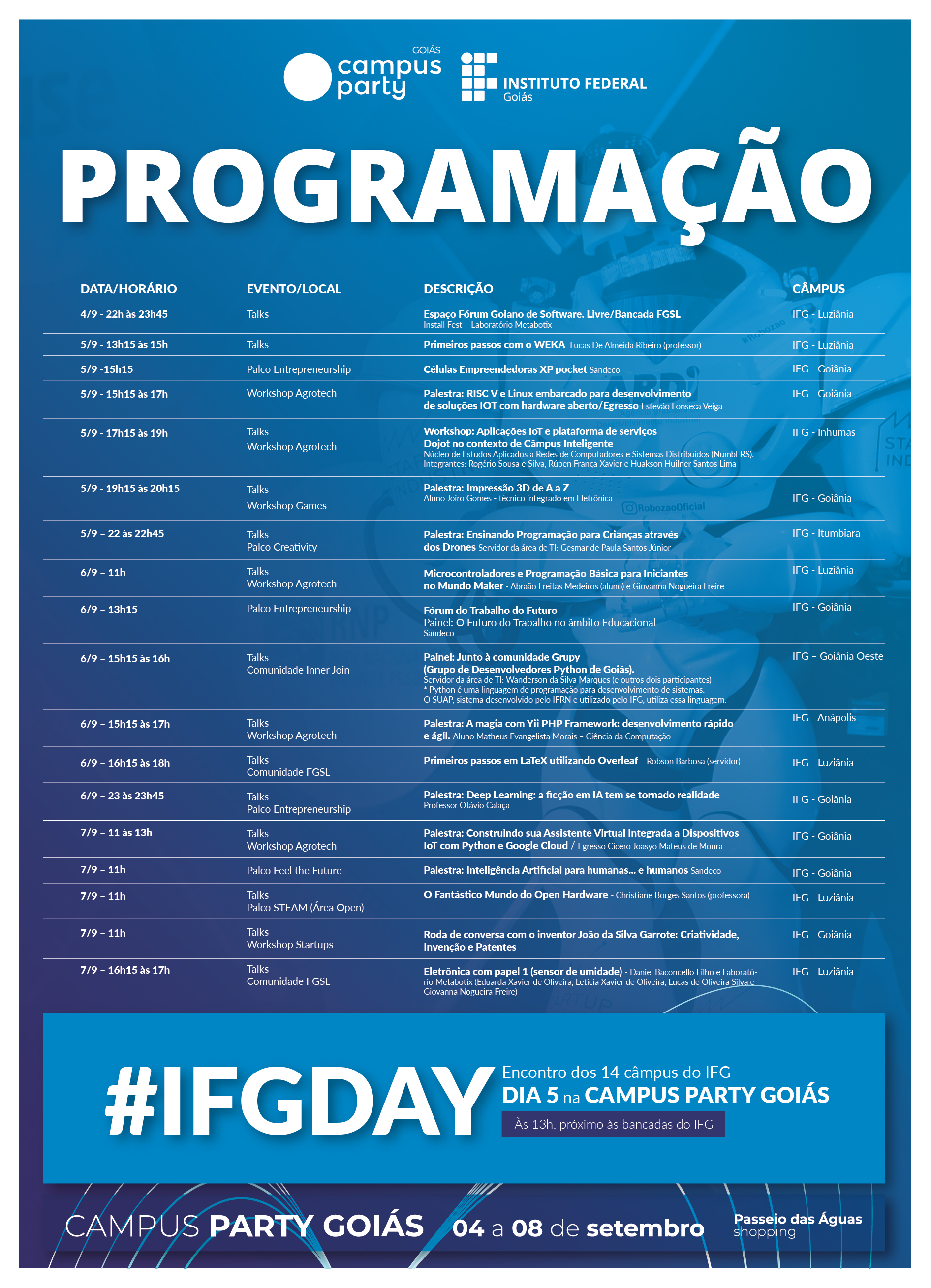 A programação do evento começa diariamente, normalmente às 11 horas. Há espaços gratuitos, na chamada Campus Future, com exposição do IFG nos dias 7 e 8, das 11 às 21 horas. Aqui os participantes dos câmpus Inhumas, Goiânia, Senador Canedo e Aparecida vão mostrar os projetos: desenvolvimento e aplicação IoT (internet das coisas) controladas por comando de voz, com o Google Assistant, SmartCap e Smartshoes: provendo acessibilidade a deficientes visuais por meio da Internet das Coisas, Smart Lab: gerenciamento de consumo energético por meio de aplicações IoT, TalkingPepper: uma pimenteira conectada à Internet , Smart e-health: telemedicina e monitoramento remoto da saúde de pacientes, Monitoramento de Poluição Atmosférica em Goiânia utilizando Nariz Eletrônico, Sky Rocket Team, Monitoramento de Poluição Atmosférica em Goiânia utilizando Nariz Eletrônico, Sky Rocket Team, Desenvolvimento e construção de um carro modelo fórmula para competição Fórmula SAE, Automatização de Sistema de Abastecimento de Reservatórios de Água Compartilhado, Luvas Transceptoras e Hardware para medir o tempo de reação.