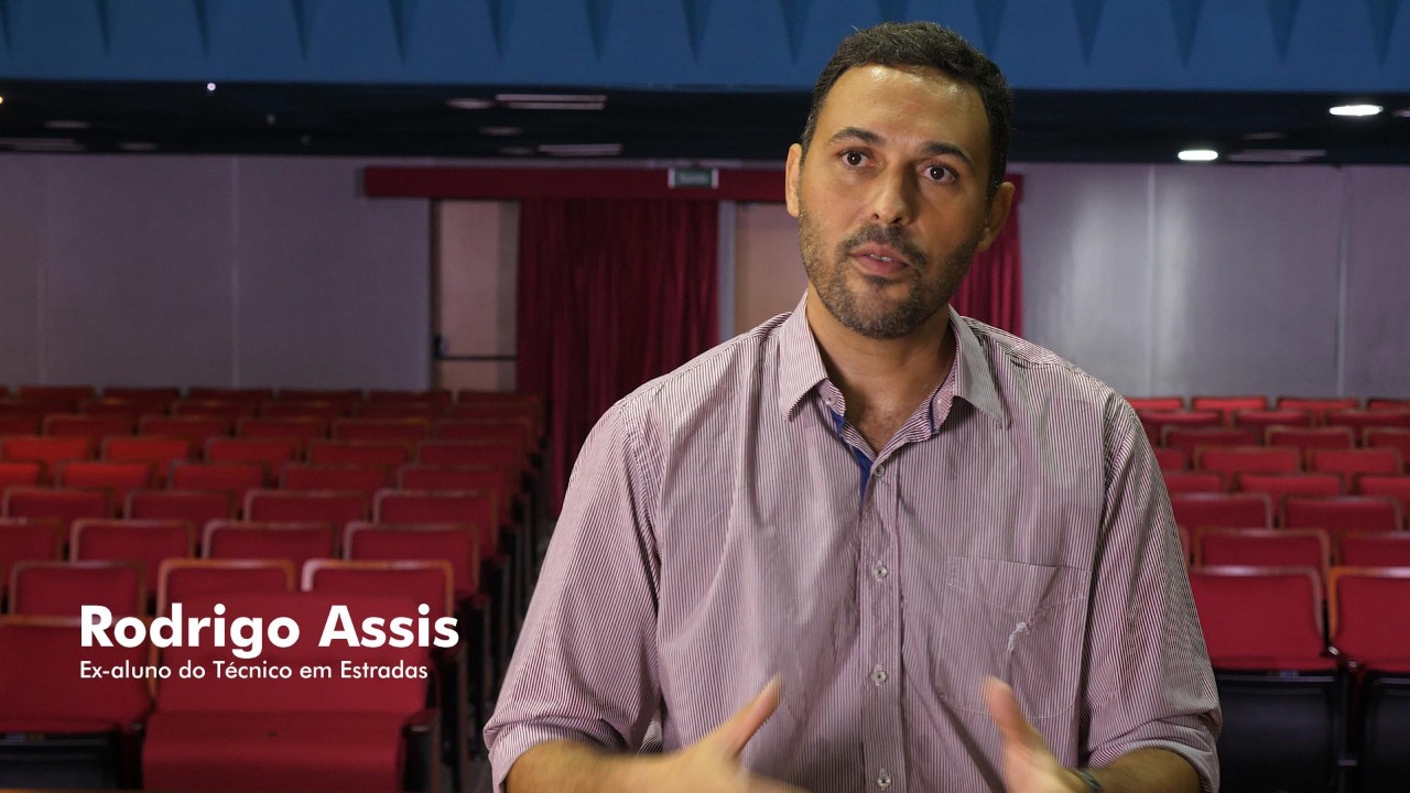 “Comecei em 1996, fiz teatro, dança. Em 1998, quando participei de um festival da instituição, aí eu disse – meu Deus, isso que quero fazer da minha vida. Tudo que sou aqui, tudo que sou hoje, nasceu nessa instituição, esse pátio... Hoje eu sou professor de iluminação cênica, sou professor de pós-graduação, sou iluminador cênico”, afirma Rodrigo Assis, ex-aluno do Técnico em Estradas.