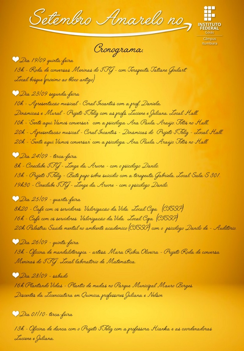 Nesta quarta-feira haverá o “Café em Valorização da Vida”, promovido pela Comissão Interna de Saúde dos Servidores Públicos (CISSP), na copa, em dois horários: às 8h20 e às 16h. E ainda uma palestra sobre saúde mental no ambiente acadêmico com o psicólogo Danilo Oliveira, às 19h, no auditório. As duas atividades fazem parte da programação do Setembro Amarelo do Câmpus Itumbiara. Outros encontros encontros e práticas de relaxamento e vivência estão programados para ocorrer até o próximo dia 1º de outubro (veja a programação completa abaixo).