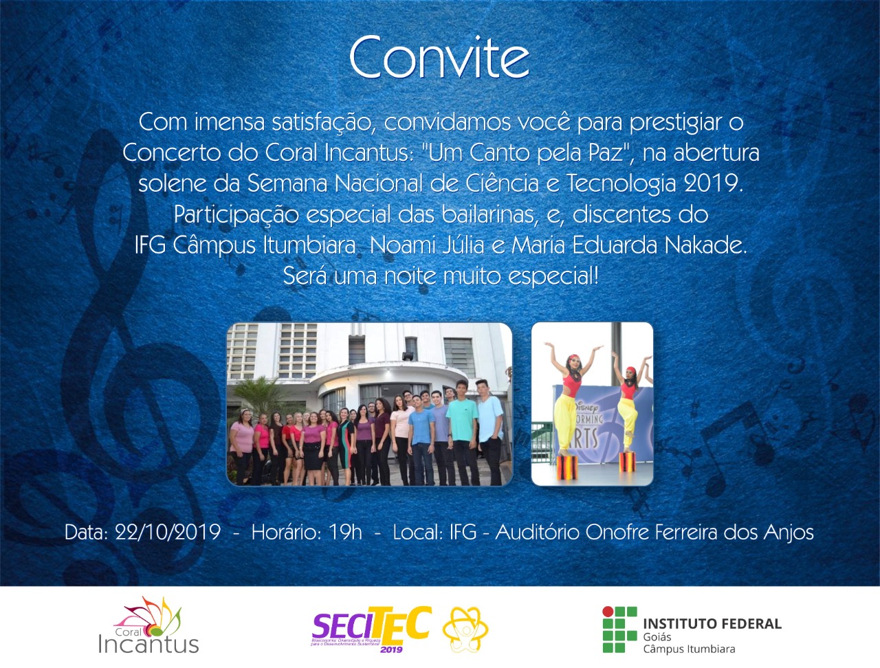 Quanto à abertura da Secitec, uma noite muito especial está sendo preparada e contará com a apresentação do concerto “Um Canto Pela Paz” do Coral Incantus, do IFG Câmpus Itumbiara. Na noite de apresentação, os coralistas serão acompanhados por bailarinas e integrantes de um coro infantil; e os organizadores promete a execução de belíssimas canções que falam de paz.