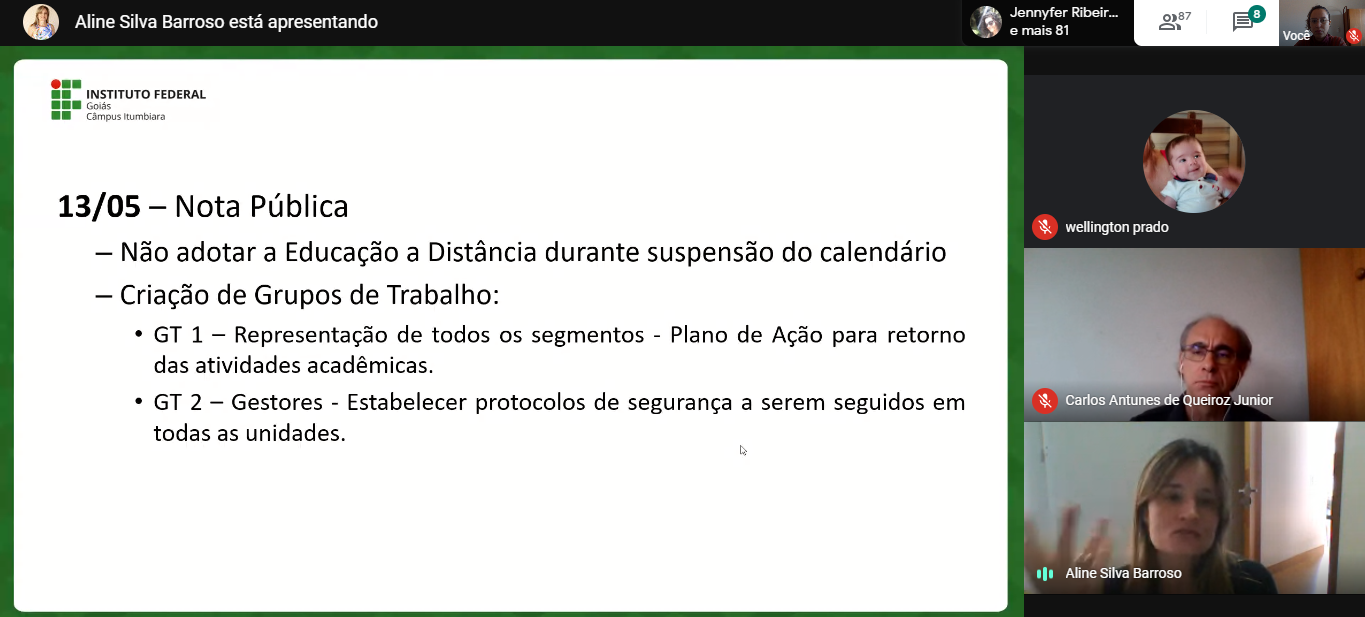 A diretora-geral Aline Barroso fez um resgate dos principais documentos e decisões tomadas pelo IFG e pelo Câmpus desde a suspensão das aulas, e explicou que a Instituição continuar a realizar, mesmo que remotamente, as atividades administrativas que não podem ser suspensas, a exemplo da gestão dos contratos de vigilância e limpeza, aquisição de bens e reuniões com gestores e servidores para definir estratégias para este período de suspensão do calendário acadêmico e condução das atividades após o retorno das aulas presenciais e/ou a distância.