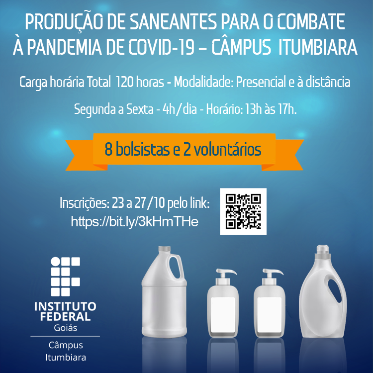 Começam hoje, 23, as novas inscrições para estudantes do IFG Câmpus Itumbiara participarem da produção de saneantes que visa ao combate da pandemia da Covid-19. Podem se inscrever para esta seleção alunos das turmas do Técnico Integrado em Química, Técnico Integrado em Agroindústria (EJA) e Licenciatura em Química. São oito vagas para bolsistas e duas para voluntários, sendo o valor da bolsa de R$ 400,00.