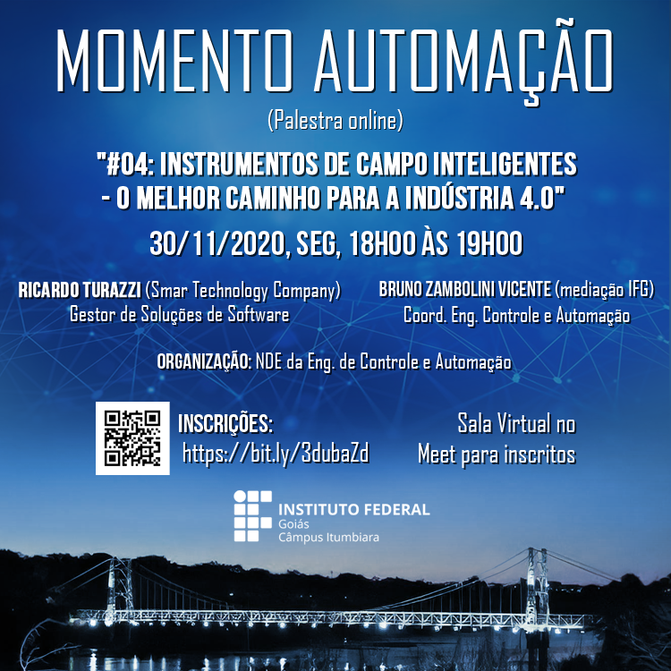 No dia 30/11, segunda-feira, das 18h às 19h, acontece mais uma palestra do Momento Automação dessa vez com o tema “Instrumentos de campo inteligentes - o melhor caminho para a Indústria 4.0". A atividade é totalmente gratuita e transmitida pela plataforma do Google Meet, e para participar, basta se inscrever aqui (https://sugep.ifg.edu.br/eventos/#/publico/eventos/5c1d9285-3ff8-42f1-bd3a-e9554f058f1e/inscricao ) e aguardar o envio do link da sala virtual.