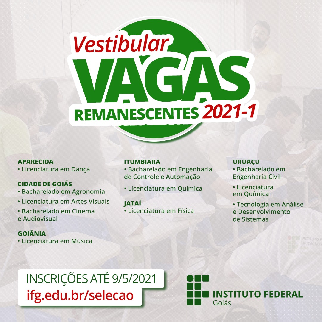 Estão abertas a partir de hoje, 30, as inscrições para as vagas remanescentes de cursos em seis câmpus do Instituto Federal de Goiás: Aparecida, Cidade de Goiás, Goiânia, Itumbiara, Jataí e Uruaçu. Os interessados precisam realizar a inscrição, que é gratuita, no site do Centro de Seleção, no menu Vestibular: http://www.ifg.edu.br/estude-no-ifg/selecoes-em-andamento/vestibular-enem.