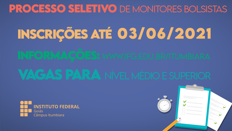 Seleção para monitores bolsistas do Câmpus Itumbiara seguem até o dia 03 de junho