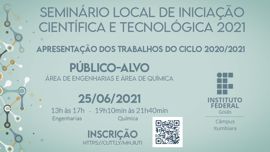Ocorre na próxima sexta-feira, dia 25 de junho, o Seminário Local de Iniciação Científica e Tecnológica. Durante a atividade, que será realizada à tarde e à noite, os estudantes bolsistas do Programa Institucional de Bolsas de Iniciação Científica, Tecnológica e Inovação (PIBICTI) apresentarão o desenvolvimento de seus projetos de pesquisa.