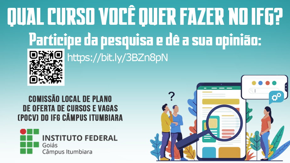O IFG de Itumbiara, por meio da Comissão Local do Plano de Oferta de Cursos e Vagas (POCV), quer ouvir a opinião da população de Itumbiara e região sobre qual curso deveria ser ofertado no Instituto. Para isso foi elaborado um questionário on-line direcionado à colaboração de estudantes e servidores, e da população em geral também.