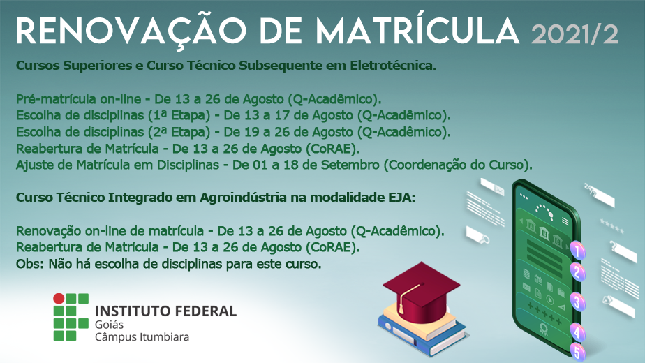 Você está aqui: Página inicial > Editais > Pesquisa e Inovação - Em andamento > IFG > Câmpus > Itumbiara > Notícias do Câmpus Itumbiara > Período de renovação de matrícula dos estudantes do IFG de Itumbiara começa dia 13/08