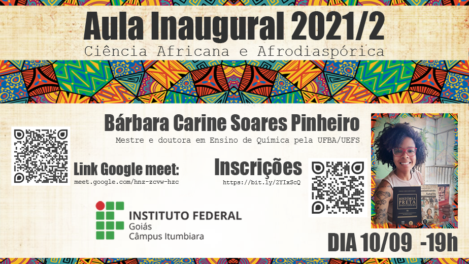 A Comissão Local de Políticas de Promoção da Igualdade Étnico-Racial (CPPIR), do Câmpus Itumbiara, está organizando a Aula Inaugural do 2º semestre letivo. A atividade será realizada nesta sexta-feira, dia 10 de setembro, às 19h, com transmissão via Google Meet. Para a Aula foi convidada a escritora, mestre e doutora em Ensino de Química, Bárbara Carine Soares Pinheiro. Atualmente Bárbara é professora adjunta e vice-diretora do Instituto de Química da Universidade Federal da Bahia (UFBA). O tema da Aula Inaugural será Ciência Africana e Afrodiaspórica.