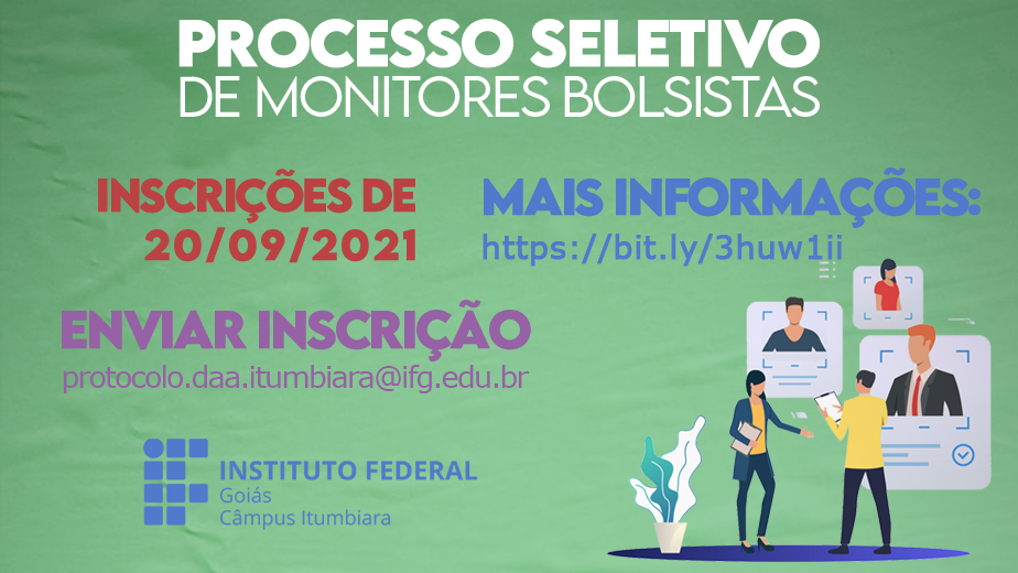 Estão abertas as inscrições para 16 vagas de Monitoria Remunerada no IFG Câmpus Itumbiara. O valor da bolsa é de R$ 360,00 e os candidatos podem se inscrever até o dia 20 de setembro. As vagas estão distribuídas nos cursos de nível médio e superior, e o processo de inscrição será totalmente on-line.