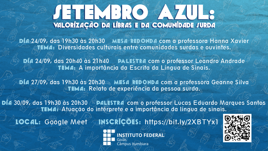 O IFG Câmpus Itumbiara iniciará esta semana o seminário “Setembro Azul: Valorização da Libras e da comunidade Surda”. A atividade será realizada das 19h30 às 21h30, nos dias 24/09 (sexta-feira), 27/09 (segunda-feira) e 30/09 (quinta-feira). A organização é da professora e intérprete de Libras, Wáquila Pereira Neigrames.