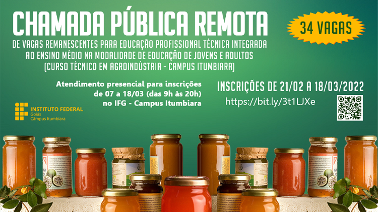 Confira o edital da seleção para o curso Técnico em Agroindústria da EJA: http://www.ifg.edu.br/estude-no-ifg/selecoes-em-andamento/eja